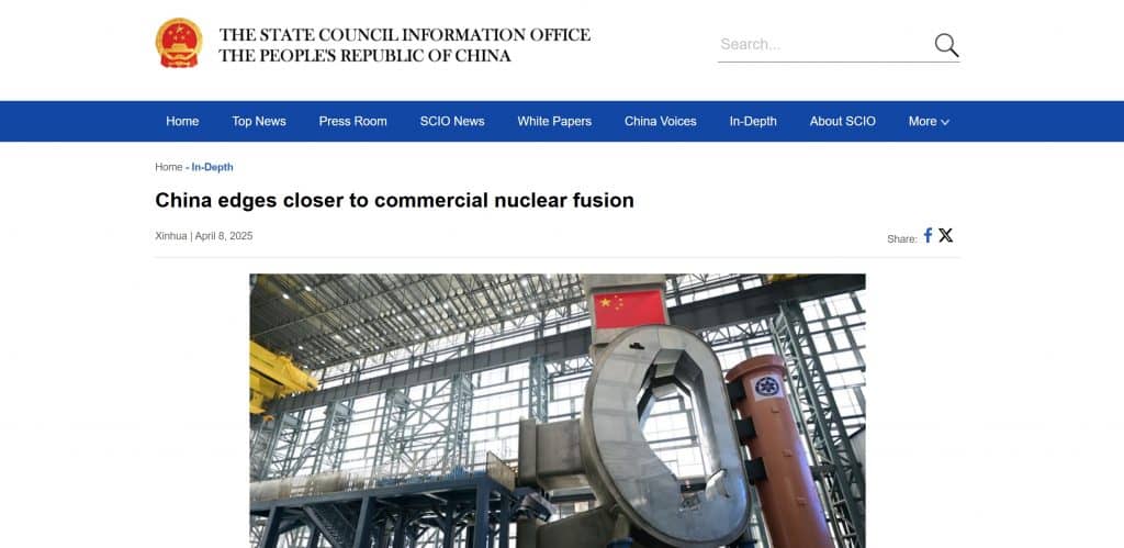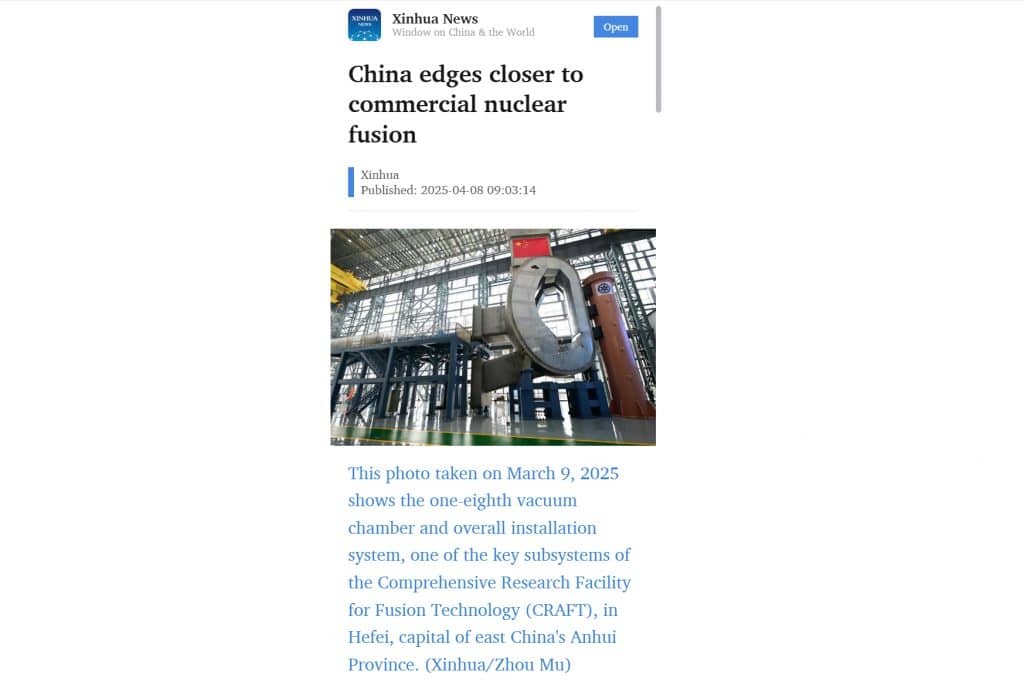 On April 8, Xinhua News Agency's overseas app published an article titled “China Edges Closer to Commercial Nuclear Fusion,” detailing China's progress in commercial nuclear fusion. The report highlighted the exploration and achievements of Chinese companies like HHMAXFusion Energy in this field. The article was also reposted on the English website of the State Council Information Office, garnering significant attention.
