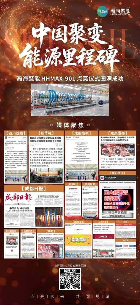 On July 18, the completion ceremony for the HHMAX-ENERGY HHMAX-901 host system and the plasma ignition ceremony were successfully held. The event attracted nearly 200 guests on-site and drew an online audience of approximately 2,400 viewers. It received in-depth coverage from nearly 40 media outlets at the central, provincial, municipal, and district levels, including official media as well as outlets specializing in finance, technology, and energy. Coverage included: Xinhua News Agency, Sichuan Television, Chengdu Daily, Red Star News, Chengdu High-Tech, Longquanyi Release, National Business Daily, Cailian Press, 36Kr, Controlled Nuclear Fusion, and others. The event sparked widespread discussion across society, collectively spotlighting the successful ignition of China's first commercial linear field-reversed configuration fusion device!