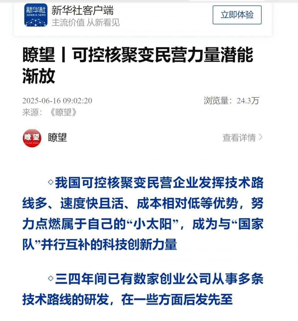 On June 16, the “Deep Insight” column of Outlook News Weekly's 2025 Issue 24 featured an article titled “Controlled Nuclear Fusion: Private Sector Potential Gradually Unleashed,” highlighting how private enterprises like HHMAX ENERGY (Chengdu) Technology Co., Ltd. are driving China's nuclear fusion industry forward. This marks the third time this year that a central-level media outlet has spotlighted HHMAX Energy and private fusion companies, underscoring media and public attention on the controlled nuclear fusion sector's development and recognition of private entities like HHMAX Energy driving progress in the field. The article was simultaneously published on the Xinhua News Agency client, where its views rapidly surpassed 200,000.